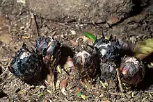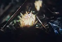 Dactylanthus taylorii, commonly known as wood rose,[3] is a fully parasitic flowering plant, the only one endemic to New Zealand. The host tree responds to the presence of Dactylanthus by forming a burl-like structure that resembles a fluted wooden rose (hence the common name). When the flowers emerge on the forest floor, they are pollinated by a ground-foraging species of native bat.