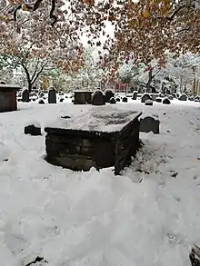 Gookin died on 19 March 1686/7, and was buried in the Old Burying Ground (Cambridge, Massachusetts), the town's main burial site opposite Harvard's Johnson gate. His table tomb is topped with a heart-shaped inset, probably the work of the Old Boston Stone Cutter, which is very similar to the one for Thomas Savage in King's Chapel Burying Ground, Boston.