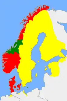 In the Treaty of Roskilde two years earlier, Denmark-Norway had been forced to cede the Danish provinces of Scania, Halland, Blekinge, the island of Bornholm and the Norwegian provinces Trøndelag and Båhuslen. The Treaty of Copenhagen reaffirmed the Swedish rule over Scania, Halland, Blekinge, and Bohuslän, while Bornholm and Trøndelag were returned. It was a significant victory for Denmark-Norway, but it did not result in a reversal of the costly earlier peace.[45] The treaty of 1660 established political borders between Denmark, Sweden and Norway which have lasted to the present.[44]