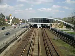 Darnytsia (Ukrainian: Дарниця) is a station on the Kyiv Metro's Sviatoshynsko-Brovarska Line. The station was opened on 5 November 1965 as part of the westwards eastwards expansion of the Brovary radius and is the second one to be fully on the left bank of the Dnieper River. It takes its name from the historic neighborhood of Kyiv, Darnytsia.