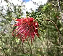 Darwinia masonii is an erect shrub typically growing to a height of 1–3 m (3.3–9.8 ft). It has closely crowded and narrow grey-green leaves that are approximately 1 cm (0.39 in) in length and almost triangular in cross section. The inflorescence consists of several small, pendant, tubular red flowers approximately 3 cm (1.2 in) in diameter and 5 mm (0.20 in) long. The flowers are surrounded by spreading pinkish pendulous bracts at the ends of small branchlets. The bracts have a prominent midrib and are wider at the base and narrower toward the apex. The style is about 1.5 cm (0.59 in) long. It blooms usually between April and November.[2][3][4][5]