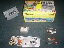 The Datach (Japanese: データック, Hepburn: Dētakku) or Datach Joint ROM System, is an aftermarket enhancement accessory by Bandai for the Family Computer, allowing the system to play select compatible games. Released on December 29, 1992, it is packaged with one game, Dragon Ball Z: Gekitō Tenkaichi Budokai. Six other games were released for it, including one of the final games for the Famicom system in 1994. It is one of two mini systems compatible with the NES or Famicom, the other being the Aladdin Deck Enhancer.