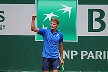 At the French Open 2012, though he did not win in the last qualifying round of the qualifications, he entered the tournament's main draw as a lucky loser thanks to the withdrawal of Gaël Monfils. In his first round, he faced world no. 27 and 23rd seed for men's singles Radek Štěpánek and beat him in five sets.[9] The second round saw Goffin take on French veteran player Arnaud Clément (who was playing his last French Open) whom he beat in five sets in a match postponed due to rain at a score of 5–1 the previous day. Goffin then beat Łukasz Kubot in the third round to become the first lucky loser to reach the last 16 of a Grand Slam since compatriot Dick Norman at Wimbledon 1995.[10] Goffin was eventually eliminated by third seed Roger Federer, but not before managing to win the first set.[11]