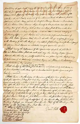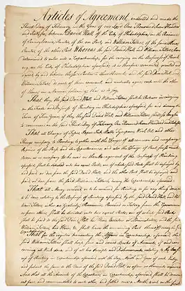 Hall was apprenticed in 1729 for five years at the age of 15 to a printing firm in Scotland run by John Mosman and William Brown.[2] Hall's friend William Strahan sent a letter to lawyer James Read of Philadelphia in January 1743 inquiring about opportunities for printers in the American colonies.[3] Strahan first recommended Hall to his wife's cousin and described him as an honest hard working person.[3] Read presented the letter to Benjamin Franklin,[3] who needed a journeyman printer.[4] Franklin sent back a letter to Strahan on July 10 inviting Hall to come to Philadelphia for a job interview. In the letter Franklin said that if Hall didn't ultimately like the position offered, he would pay his expenses back to England. Franklin offered Hall 12 months of Good Work for the trouble of coming from England and trying the journeyman printer position.[5] Hall accepted the offer and came to Philadelphia on June 19, 1744.[2]
