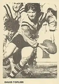 David Topliss (29 December 1949 – 16 June 2008), also known by the nickname of "Toppo", was an English World Cup winning professional rugby league footballer who played in the 1960s, 1970s and 1980s, and coached in the 1980s and 1990s. He played at representative level for Great Britain, England and Yorkshire, at club level for Wakefield Trinity (Heritage № 746) (two spells) (captain), Penrith Panthers, Balmain Tigers, Hull F.C.(Heritage №) (captain) and Oldham (Heritage №), as a stand-off, i.e. number 6,[1] and coached at club level for Wakefield Trinity.[4]