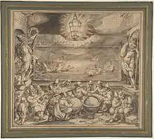 David Vinckboons (baptized 13 August 1576 – c.1632 ) was a Dutch Golden Age painter born in Mechelen, Southern Netherlands. Vinckboons, whose name is often spelled as Vingboons, Vinghboons, Vinckebonis or Vinckboom, had at least ten children. His sons were the cartographer and watercolourist Johannes and the architects Justus and Philip. Vinckboons himself died in Amsterdam.