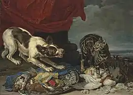 De Coninck's teacher Pieter Boel was a pupil of Jan Fyt, the leading Flemish animal painter of the mid 17th century. This explains the influence of Jan Fyt's style on de Coninck's work.[6] Some works of David de Coninck and Pieter Boel are still attributed to Fyt.[7] As David de Coninck rarely signed his works, which are generally of a high quality and similar style they have often been confused with the works of Boel, Fyt and even Frans Snijders, the leading Flemish animal painter of the first half of the 17th century.[1]