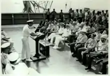 Support for continued military involvement in this effort included the President in his role as Commander-in-Chief, and both the first and second editions of the Department of Defense Guide included signed Presidential letters endorsing the effort. In 1984, the first official year of military involvement, Rabbi Seymour Siegel, Executive Director of the United States Holocaust Memorial Council, met Vice Admiral Edward Martin, Commander, United States Sixth Fleet.[10] As a result of that meeting, the first shipboard Holocaust Days of Remembrance Ceremony was conducted on board USS Puget Sound (AD-38), the Sixth Fleet Flagship, during a port visit to Málaga, Spain.[11]