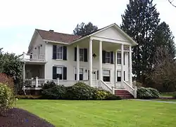 Nearby, in Courthouse Square Park, is the Fort Yamhill Block House, which was brought to Dayton in 1911 to prevent its demolition. The structure had been built by Willamette Valley settlers on Fort Hill in the Grand Ronde Valley in 1855 and 1856. John G. Lewis, a citizen of Dayton, secured permission from authorities to move the logs to Dayton, where they were reassembled.[6]