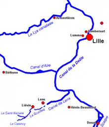 - the high gauge canal known as Canal de la Deûle which ensures the connection between the channeled Lys and the Scarpe (a tributary of the Scheldt) in Douai,[1]
