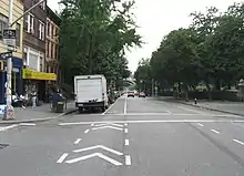 It runs from Woodward Avenue (Linden Hill Cemetery) in Ridgewood, Queens to Downtown Brooklyn, stopping at the Fulton Mall where the Dime Savings Bank and City Point meet. Between Woodward Avenue and Bushwick Avenue, DeKalb Avenue is a two-way, two-lane street; between Bushwick Avenue and Fulton Street, it is one-way westbound. (Lafayette Avenue is the corresponding parallel one-way street eastbound.) A bike lane, installed in 2004 and extended in 2008, exists between Malcolm X Boulevard and Flatbush Avenue.