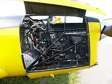 The structure of the Chipmunk makes heavy use of metal, the majority of the airframe being composed of a stress-skinned alloy; this allowed the adoption of thinner wings and consequently provided for increased performance as well as a greater degree of durability.[4] Numerous features were incorporated in order for the type to better perform in its trainer role, including hand-operated single-slotted wing flaps, anti-spin strakes, disc brakes on the wheeled undercarriage, a thin propeller composed of a solid lightweight alloy, the adoption of an engine-driven vacuum pump in place of external venturi tubes to power cockpit instrumentation, electric and Coffman cartridge engine starters as alternative options, cockpit lighting, onboard radio system, and an external identification light underneath the starboard wing.[4]