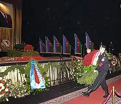 The farewell ceremony was held 15 December 2003 at the Palace of the Republic (nowadays Heydar Aliyev Palace) and was broadcast live on the main Azerbaijani TV channels. The funeral lasted seven hours and was attended by 250,000 people.[5][6] At 9.00 local time, the farewell ceremony began, with a guard of honor from the National Guard of Azerbaijan being lined up at the coffin. After the official ceremony, a procession of many kilometres took place. After staying in Baku for only an hour and a half, Putin and Nazarbayev went left the ceremonies early via Bina International Airport.[7] Heydar Aliyev was buried in the Alley of Honor next to his wife Zarifa Aliyeva. During the funerals artillery salute was given.[8][9]