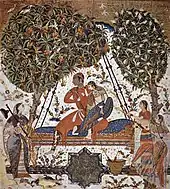 Some of the earliest surviving paintings are the twelve illustrations of a manuscript Tarif-i-Hussain Shahi, an epic-style poem on the life of Sultan Hussain Nizam Shah I of Ahmadnagar, leader of the Deccan alliance that defeated the Vijayanagara Empire. The manuscript was commissioned by his widow when she was acting as regent c. 1565–69, and is now in the Bharat Itihas Sanshodhak Mandal, Pune.[12] Six of the paintings, most unusually for India, show the queen prominently beside her husband, and another a traditional female-centred scene. Most of the portraits of the queen were scratched out or overpainted after her son Murtaza Nizam Shah I rebelled and imprisoned her in 1569.[13]