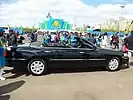 2015 celebrated the 23rd anniversary of the Kazakh Armed Forces and the platinum jubilee (70th anniversary) of the Great Patriotic War (known as the Second World War in the West).[17][18][19] Noting the timing of the parade with the anniversary, President Nazarbayev said that it "shows the continuity of military traditions between the World War II winners and the current generation of defenders of our land."[20] Minister of Defence Imangali Tasmagambetov accompanied President Nazarbayev in his inspection of the troops during the parade. An exact copy of the Victory Banner, was delivered to Astana from the Museum of Great Patriotic War in Moscow. It consisted of two parts – historic and contemporary, with the former being represented by troops depicting Kazakh field units of the Red Army, including the 72nd Guards Rifle Division that was raised in Akmolinsk (now Nur-Sultan) in 1942. The legendary Katyusha rocket launcher was presented at the parade for the first time.[21] Military pilots performed aerobatics singly and as part of aerobatic teams, and also built the number "70", which symbolizes the anniversary of the Great Victory.[22]