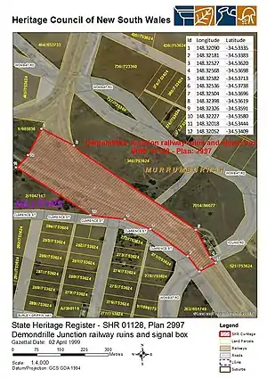 The remains of the railway precinct at Demondrille were added to the New South Wales State Heritage Register on 2 April 1999.[2]