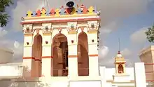 In the shrine is a red -smeared triangular conical stone in which Dhoramnath is said to have rested his head when performing penance. Outside of the shrine is the original ascetic's fire, dhuni, which is lighted three days in Bhadrapad (August–September), when the head, Pir, of the monastery comes to worship and receives homage from the people of the neighboring villages. At the foot of the hill, amongst the monastery buildings, is another temple to Dhoramnath on a raised platform facing the east, about seven feet square and with walls about seven feet high. Inside is a three feet high marble image of Dhoramnath, some small lingas, and other brass and stone images, and a lamp always kept burning. In a large shed near is an ascetic's fire, dhuni said to have been burning since the time of Dhoramnath. In August and October, at the Janmashtami and Navratri festivals, rice and wheat flour sweetened with sugar are cooked and given to the people.[3][4][5]