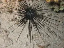 Diadema paucispinum is a small sea urchin with very long, moveable spines which are slender and sharply pointed. They can be up to 25 cm (10 in) long and about four times the diameter of the test. The primary spines are bluish-black in colour, often with pale bands in younger individuals. The shorter secondary ones are brittle and venomous and easily break off in the skin.[2] There are photosensitive spots in the urchin's epidermis and if a shadow falls on the animal, it angles its secondary spines towards the intruder. These can cause a painful sting if they come into contact with bare skin.[2] Near the apex of the test is a clearly visible anus surrounded by an orange ring and raised on a small projection. Radiating from this are five narrow, bright blue lines.[2][3]