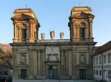 The stone facade dates from 1700. The original single-tower facade was reconstructed by Leopold Dietrichstein. It was designed by Viennese architect Johann Bernhard Fischer von Erlach in a Roman monumental Baroque style.