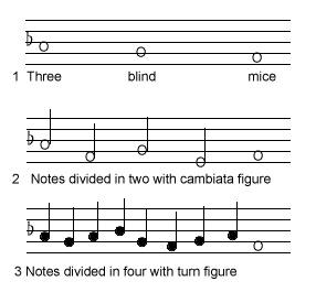 In music, division (also called diminution or coloration) refers to a type of ornamentation or variation common in 16th- and 17th-century music[1] in which each note of a melodic line is "divided" into several shorter, faster-moving notes, often by a rhythmic repetition of a simple musical device such as the trill, turn or cambiata on each note in turn, or by the introduction of nonchord tones or arpeggio figures.