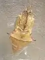 The pupae have an unusual shape, with a pointed 'nose' and a notable spike on each side of the body protruding from a broad, flattened area midway down the body. There is a smaller spike both to the fore and rear of each of these larger spikes, and a small spike on each side of the body just to the rear of the head. The larger spikes resemble to some extent the double, hooked thorns on the stems of the food plant, Capparis tomentosa (see image). The pupae may be pale green, dark green or brown in colour. The wing areas show whitish or yellowish with dark spots near to hatching and the body becomes greyish.