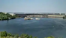 The Dnieper Hydroelectric Station dam is an important crossing of the Dnieper. It has a water lock that allows navigation along the river and around the dam. There is also a bridge over the lock that carries a highway that connects the banks of the Dnieper.