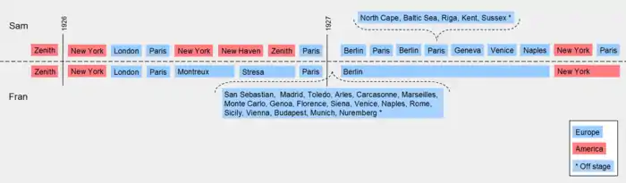 The novel includes detailed descriptions of Sam and Fran's tours across Europe. In the beginning, they leave their mid-Western hometown of Zenith, board a steam liner in New York and cross the Atlantic Ocean. Their first stop is England. They visit the sights in London and are invited by Major Clyde Lockert to join a weekend trip to the countryside. Later, after Lockert has made an indecent proposal to Fran, they depart for Paris, where she soon engages in a busy social life and he takes up sightseeing. When Sam decides to go back to America for his college reunion in New Haven, Fran spends the summer months on the lakes near Montreux and Stresa, where she has a romance with Arnold Israel. Once Sam has picked her up in Paris, they agree to continue their travels together, touring France, Italy, Spain, Austria, Hungary and Germany. Their marriage comes to an end when she falls in love with Kurt von Obersdorf in Berlin. Whereas she stays on with her new love, he criss-crosses Europe in an attempt to cope with his new situation. When Sam happens to run into Edith in Venice, she persuades him to accompany her on a visit to a village in the vicinity of Naples. Fran's fiancé calls off the marriage, and Sam joins his former wife on her voyage back to New York. Three days later, he is back on the next ship to meet Edith in Paris.