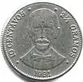 After 1963 the Peso Oro became a fiat currency and base metals replaced silver in the higher denominations, with the 10, and 25 centavos and 1⁄2 pesos reintroduced in copper-nickel in 1967. 1 peso coins were struck as only commemorative in small numbers. In 1976 a new coin series was introduced featuring Juan Pablo Duarte, and in 1983 another series was released featuring various other figures important to Dominican history, including the Mirabal sisters and formally dropping the outdated "gramos" denomination reference. In 1989, the content of the coins was changed from copper-nickel to nickel-plated steel. In 1991, eleven sided circulating non commemorative 1 peso coins were reintroduced in copper-zinc, followed by bimetal 5 pesos in 1997, and a bimetal 10 pesos and copper-nickel 25 pesos in 2005. Due to inflation, any coins below 1 peso are now rarely found.