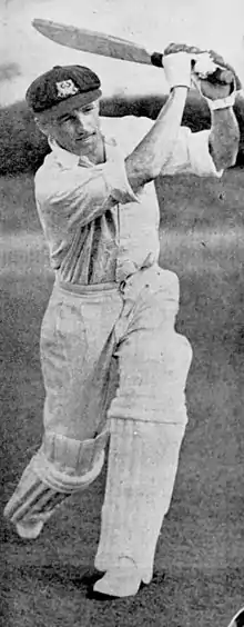 Employing a wide, side-on stance at the crease, Bradman preferred to keep perfectly still as the bowler ran in.[3] Placing the bat between his feet (rather than behind his rear foot) was another unorthodox feature of his game.[4] All these elements combined to give his backswing a "crooked" look, in that the face of the bat pointed at the slips cordon, rather than going straight, as advised in the coaching manuals. This "crookedness" troubled his early critics, but Bradman resisted any major technical changes and it became a moot point after he broke the record for the most runs in a Test series during the 1930 tour of England.[5]