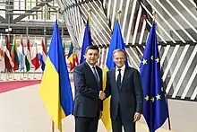 On 6 February 2019, Tusk held talks with Irish Premier Leo Varadkar in Brussels to discuss Britain's departure from the European Union, stating that there was a "special place in hell for those who promoted Brexit without even a sketch of a plan how to carry it out safely".[96][97] Tusk opened his statement by saying there were 50 days to go until the UK's exit from the EU: "I know that still a very great number of people in the UK, and on the continent, as well as in Ireland, wish for a reversal of this decision. I have always been with you, with all my heart. But the facts are unmistakable. At the moment, the pro-Brexit stance of the UK Prime Minister, and the Leader of the Opposition, rules out this question. Today, there is no political force and no effective leadership for Remain. I say this without satisfaction, but you can't argue with the facts."[96] On 24 August 2019 in Biarritz for the G7 Summit, Tusk addressed reporters regarding Brexit, stating "one thing I will not cooperate on is no deal." He also said he hoped that Boris Johnson would not go down in history as 'Mr No Deal'.[98][99] In September 2019, Tusk said that the EU should open accession talks with both Albania and North Macedonia.[100]
