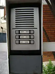 A door phone or door bell phone is a set of electrical and electronic elements used to handle two-way communication (street to home) in houses, apartments or villas. The device is connected to a secure communication system used to control the opening of the door giving access to any kind of buildings, offices, or apartment blocks. They are so widely used in the mentioned structures, that nowadays, they form part of the standard electrical installation of most buildings.[1]