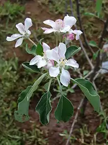 'Dorsett Golden' is a 'Golden Delicious'-like cultivar of domesticated apple and is descended from it, but is different with that it is early season, and most importantly, it needs a lower amount of cold weather (less than 300 hours) to go into blooming, so it is possible to grow in warm climates.[2]