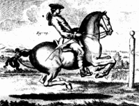 The left hand holds the left bradoon rein below the fourth finger (pinkie), the left hand curb rein between the third and fourth fingers, and the right hand curb between the second and third fingers. It is held right over the pommel of the saddle.[4] The right hand holds the bradoon as it would normally hold a snaffle (between the third and fourth fingers), and the hand is held very close to the left hand. This hold has several important consequences: it decreases the action of the curb, it prevents the rider from riding with their hands too wide or performing an overzealous opening rein with their left hand, and it shows when the horse is not properly straight, because the rider can no longer make the rein pressure on one side of the mouth any stronger than the other, since reins from both sides are held in the left hand. The rider must ride off the seat and legs to bend the horse, and the horse must therefore be properly "through".[4]
