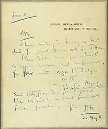 By 1909 it seemed likely to Haldane and Haig that an Anglo-German War loomed and Haig was at first reluctant to accept appointment as Chief of the General Staff in India.[77] He passed the Director of Staff Duties job to his loyal follower Brigadier-General Kiggell (later Chief of Staff BEF), to whom he wrote with "advice" every fortnight. Haig, who had been knighted for his work at the War Office, was promoted to lieutenant-general in November 1910.[78] In India he had hoped to develop the Indian General Staff as part of the greater Imperial General Staff, and to organise despatch of Indian troops to a future European War. A plan he envisaged for mobilising the Indian army to send to Europe in the event of war there was vetoed by Viceroy Lord Hardinge. In the event an Indian Corps would serve on the Western Front early in the conflict, and Indian troops were also used in comparatively small formations the Middle East.[79]