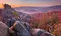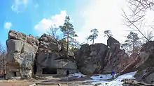 The Rocks of Dovbush is a group of natural and man-made structures carved out of rock at around 980 m ASL approximately 3 km from the village Bubnyshche in the Ivano-Frankivsk Oblast (province) of western Ukraine. The name of the formations comes from a leader of the opryshky[1] movement, Oleksa Dovbush.