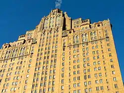The Drake Hotel, a historic 375-foot-tall, 33-story luxury hotel located at 1512–1514 Spruce Street at the corner of S. Hicks Street between S. 15th and S. 16th Streets in the Rittenhouse Square neighborhood of Philadelphia, Pennsylvania was built in 1928–29 by the Murphy, Quigley Company and was designed by the architectural firm of Ritter and Shay in the Art Deco style with Spanish Baroque terra cotta ornamentation on themes surrounding Sir Francis Drake, including "dolphins, shells, sailing vessels and globes." The building is topped by a terra cotta dome.[3]