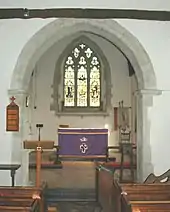 The Church of England parish church of Saint Leonard and Saint Catherine existed by 1146, when it was a chapel of the peculier of Dorchester Abbey.[2] The Norman doorways in the north and south walls date from this time.[2] In the 13th century a transeptal chapel was added on the north side and new windows were inserted in the nave,[2] all in the Early English Gothic style. The bell tower is timber, which is unusual for Oxfordshire,[3] (though there is a similar timber tower with a pyramid roof at Berrick Salome).[4] The oldest bell was originally cast in 1470,[5] which could also be the date that the tower was built. In the 16th century two of the nave windows were enlarged in the Perpendicular Gothic style.[6]