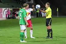 A dropped-ball (or drop-ball) is a method of restarting play in a game of association football. It is used when play has been stopped due to reasons other than normal gameplay, fouls, or misconduct. The situations requiring a dropped-ball restart are outlined in Law 8 and Law 9 of the Laws of the Game; Law 8 also contains the dropped-ball procedure.[1]