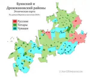 According to statistics from January 2020, 21,569 people live in the Drozhzhanovsky district [4]. The population of the district is mixed with Tatars making up 57.5% Chuvash 41.1% and Russians 1.1%.[4][15]