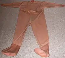 A dry suit or drysuit provides the wearer with environmental protection by way of thermal insulation and exclusion of water,[1][2][3][4] and is worn by divers, boaters, water sports enthusiasts, and others who work or play in or near cold or contaminated water. A dry suit normally protects the whole body except the head, hands, and possibly the feet. In hazmat configurations, however, all of these are covered as well.[5]