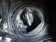 Before truly watertight zippers were invented, other methods of keeping the suit waterproof at the entry point were used, with the most common being a long rubber entry tunnel which would be folded shut, then rolled together from the sides and finally folded and clamped with a metal clip.[7]:14 An early example was the Sladen suit, where the entry tunnel was at the front of the torso. The Louisiana-based dry suit company Aquala makes a "historical" diving suit of that kind.[15] Another type of entry featured a rubber tunnel that protruded through a non-watertight zipper. The tunnel would be rolled shut and the zipper closed to hold the roll in place.