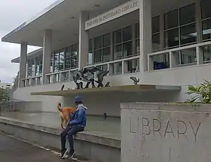 The Du Pen Fountain is a water fountain at the former Washington State Library building on the Washington State Capitol campus in Olympia, Washington, in the United States. The sculptor, Everett Du Pen (1912–2005),[1] was well known in the Northwest, and chairman of the Sculpture Department at the University of Washington when he was commissioned for the piece in 1955. The fountain is made of 900 pounds (410 kg) of copper-enriched bronze, green terrazzo, and cement.[2][3] An element of the fountain is a pair of salmon spitting water. The fountain, along with the nearby and much larger Tivoli Fountain replica, is shut down by the state property administration agency during summer droughts.[4][5] The artist also created the Fountain of Creation at the Seattle Center for the 1962 World's Fair.[6] The Seattle fountain is also nicknamed Du Pen (or DuPen) Fountain.[7]