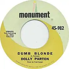 "Dumb Blonde" is a song written by Curly Putman and recorded by American singer-songwriter Dolly Parton. It was released as a single on November 7, 1966, by Monument Records. It would be included on Parton's 1967 debut album, Hello, I'm Dolly. The song is notable for being Parton's first song to chart on the Billboard Hot Country Singles chart, peaking at number 24. Parton re-recorded the song with Miranda Lambert in 2018 for the Dumplin' soundtrack album.
