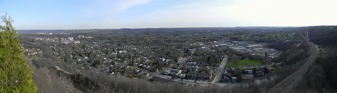 Dundas /ˈdʌnˌdæs/ is a community and former town in Hamilton, Ontario, Canada. It is nicknamed the Valley Town because of its topographical location at the bottom of the Niagara Escarpment on the western edge of Lake Ontario. The population has been stable for decades at about twenty thousand, largely because it has not annexed rural land from the protected Dundas Valley Conservation Area.