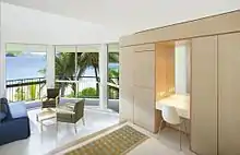 The damage to the resort was described as being very severe, with much of the resort needing to be completely rebuilt. The usually cyclone-hardy palm trees were stripped.[41] The resort's pool was filled with sand from the storm surge, the function hall was gutted, and the health centre was unroofed. Almost all of the beachfront apartments had their walls torn off.[42] The gardens of the resort were stripped bare.