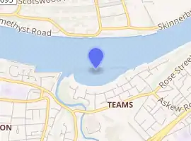 Dunston is particularly known for wooden coal staiths, first opened in 1893 as a structure for loading coal from the North Durham coalfield onto ships.[1] In the 1920s, 140,000 tons of coal per week were loaded from the staiths, and they continued to be used until the 1970s. They were also a shipping point for coke produced at the nearby Norwood Coke Works, as well as pencil pitch manufactured at the Thomas Ness Tar Works using by-products from the Norwood plant and the Redheugh Gasworks. Throughout their working life, motive power for shunting wagons on the staiths and in their extensive sidings known as the Norwood Coal Yard came in the form of locomotives from Gateshead MPD. The staiths' output gradually declined with the contraction of the coal industry, and they were finally closed and partially dismantled in 1980. Now redundant, the railway lines leading to the staiths were lifted, finally allowing the demolition of several low bridges that had become a nuisance to bus operators by limiting the routes available to double-deckers in the area. For many years, the men who worked on the staiths, known as teemers (the men who released the coal from the wagons and operated the loading chutes and conveyors) and trimmers (who had the dangerous job of ensuring the stability of the colliers by levelling the load in their holds as they were filled), had their own room in the nearby Dunston Excelsior Club. For anyone not employed in the club or on the staiths, access to the room was strictly by invite only, and the staithesmen held a reputation for unceremoniously ejecting anyone who fell foul of this rule.
