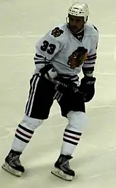 He had a goal in his first shift with the Blackhawks in the 2007–08 season on November 3 against the St. Louis Blues and recorded his first career hat-trick against the Phoenix Coyotes on November 30.[6] He finished tied for fifth on the team with 19 goals and 36 points in his third season with the team, all while making a transition to forward throughout the campaign. He played a major role in the Blackhawks' Stanley Cup winning season in 2010, scoring 11 goals with five assists in the playoffs, including three goals in the Finals.[7]