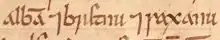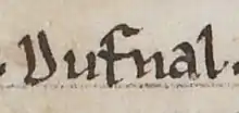 ![]() Dyfnwal's name as it appears on folio 15r of Oxford Bodleian Library Rawlinson B 488 (the Annals of Tigernach): "Domnall mac Eoain".[1][note 1] | |