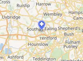 Ealing Hospital is a district general NHS hospital, part of London North West University Healthcare NHS Trust, located in the Southall district of the London Borough of Ealing, West London, England. It lies on the south side of the Uxbridge Road 8.5 miles west of central London. It sits between Southall town centre to the west and Hanwell to the east. It is built on land that was once part of St. Bernard's Hospital which is run by West London Mental Health (NHS) Trust.