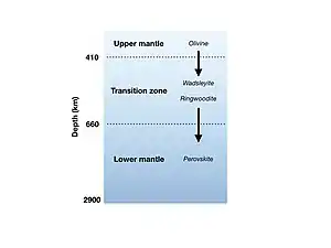 - the transition zone (approximately 410–660 km or 250–410 mi), in which wadsleyite (≈ 410–520 km or 250–320 mi) and ringwoodite (≈ 525–660 km or 326–410 mi) are stable